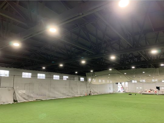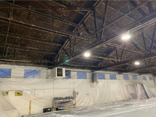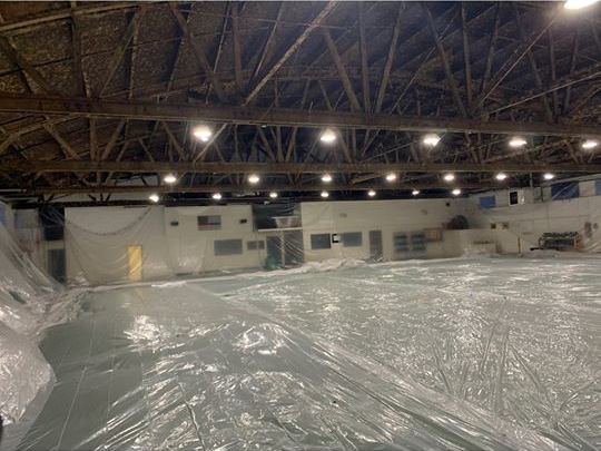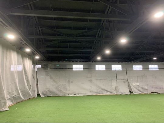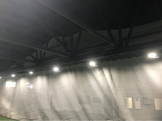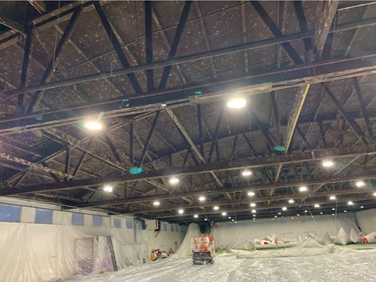 This was a very challenging job as we had to cover all the LED lighting, walls and AstroTurf flooring. Another very challenging part of this project was that we could not disrupt the customer’s business, so we had to set up Monday morning and break down by Thursday at noon. The project was broken into two halves and done in two weeks. We used one coat of stain-blocking latex primer and one coat of latex dry fall.
